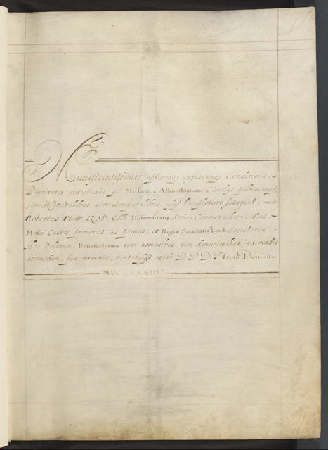 Munificentissimis optimisque cujuscunque Conditionis Dignitatis aut Sexûs, qui Museum Ashmoleanum Cimelijs quibuscunque, sive Naturalibus sive Artificialibus, usque Locupletare satagunt; Robertus Plott LL.D. Coll: Universitatis Socio-Commensalis; istius Musæi Custos primarius ac primus; et Regiæ Societatis Lond. Secretarius; Hoc Volumen, Benefactorum tum nominibus, tum donationibus inserendis accomodum, piæ, memoriæ, virtutisque causâ, D.D.D. Anno Domini MDCLXXXIII.