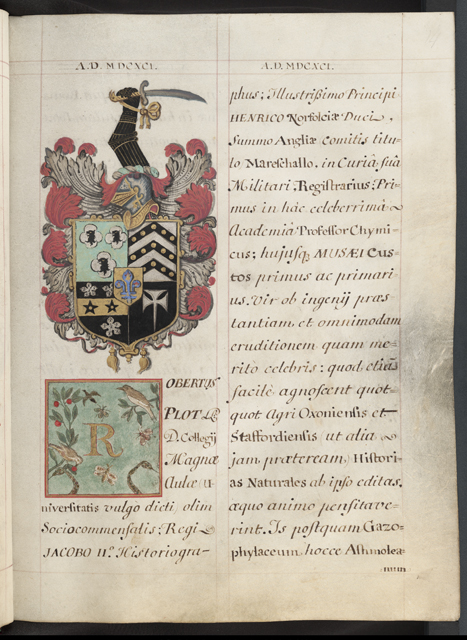 ROBERTUS PLOT LL: D. Collegij Magnæ Aulæ, (Universitatis vulgò dicti) olim Sociocommensalis; Regi JACOBO II.? Historiographus; Illustrissimo Principi HENRICO Norfolciæ Duci, Summo Angliæ (Comitis titulo) Mareschallo, in Curiâ suâ Militari, Registrarius; Primus in hâc celeberrimâ Academiâ Professor Chymicus; hujusque MUSÆI Custos primus ac primarius. Vir ob ingenij præstantiam et omnimodam eruditionem quam meritò celebris: