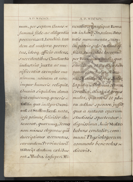 quod etiã facilè agnoscent quotquot Agri Oxoniensis et Staffordiensis (ut alia jam præteream) Historias Naturales ab ipso editas, æquo animo pensitaverint. Is postquam Gazophylaceum hocce Ashmoleanum, per septem Annos summâ fide ac diligentiâ procurasset, Londini tandem ad majora provectus, ideoque officio cedens, succedentibus Cimeliarchis industriæ juxta ac munificentiæ exemplar maximum (utinam et non impar humeris) reliquit. Omnia siquidem donavit cujuscunque generis Fossilia quæ in Agro Oxoniensi et Staffordiensi nata, ipse primus feliciter detexerat, quorumque Icones non minus elegantes quã descriptiones accuratas, earundem Provinciar? Historijs dudum exhibuerat. Multa insuper Mineralia, et antiqua Romanæ in hanc Insulam Potestatis monumenta, cum in patrio solo Cantiano effossa, tum alibi locorum per Britanniam undique quæsita; Quin et exotica non pauca, Conchylia, Mineras, Metalla; Terras, Salia, Lapides; Alcyonia, Poros, Corallia, aliaque id genus multa, (quamvis et plura adhuc sperare jussit) quæ à naturæ operum studiosis spectentur dignissima, huic Musæo lubens contulit; communi Physiologorum commodo benevolus dicavit.