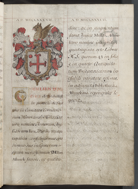 GULIELMUS DUGDALE de Blithe Hall in par?cià de Shustoke in Comitatu Cornaviorum Warwicensi Miles, Garterij nomine Armorum Anglicorum Rex, Vir in re antiquariâ consultissimus, pro summo suo in Generum suum meritissimum D. Eliam Ashmole favore, ac gratitudine; ac in augmentum famæ hujus Musæi, Ashmoleano nomine insigniti; quadraginta octo Libros M.S. (quorum 43 in folio, 5 in quarto) Antiquitatum Britannicarum ineffabili varietate refertos, in adjunctâ Bibliothecâ Ashmoleanâ reponendos legavit.