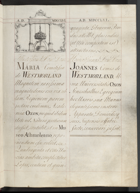 Honoratissimus Dom: Dom: JOANNES Comes de WESTMORLAND Almæ Universitatis OXON Seneschallus Egregium hoc Uxoris suæ Munus elegantissimo instrui Apparatu, Domicilioque suis Impensis affabre jacto, conservari jussit.