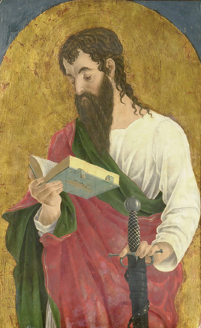 After his training with Squarcione in Padua from 1453, Marco worked mainly for Venetian and Bolognese patrons. This shaped panel comes from the upper tier of a polyptych, probably that made in 1468 for the church of Santa Giustina, Venice. Three other panels have been identified, St Augustine, St Peterand St Jerome, all from the upper register and all lit from the right. St Paul is shown with a sword, the instrument of his martyrdom and a book, a reference to his Epistles.